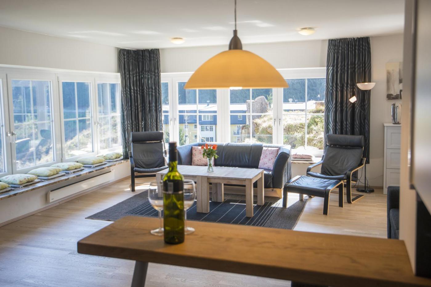The Alpenhof was renovated in 2009 and its bright apartments feature fresh white walls and light wood flooring and furniture, which combine well with the dark grey sofas and carpets.