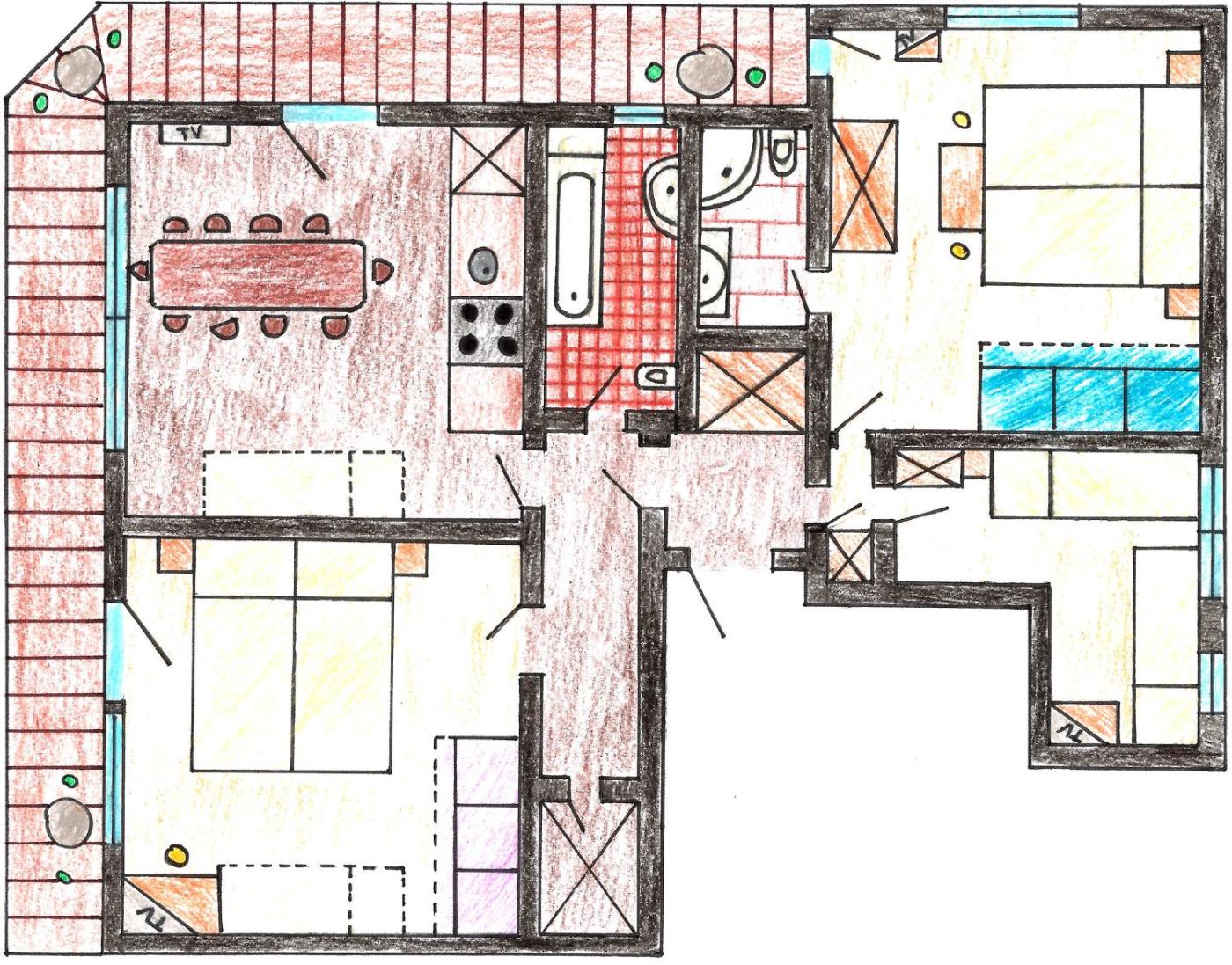 Deluxe Four-Bedroom Apartment. This spacious apartment comes with a 30 m² balcony with mountain views, 4 bedrooms, each with flat-screen satellite TV, a fully equipped kitchenette with a dining area, and a bathroom with bath or shower and toilet. Towels and linen are featured. On request baby equipment can be provided. Please note that a security deposit is required and will be refunded if there is no damage on the day of departure. ;