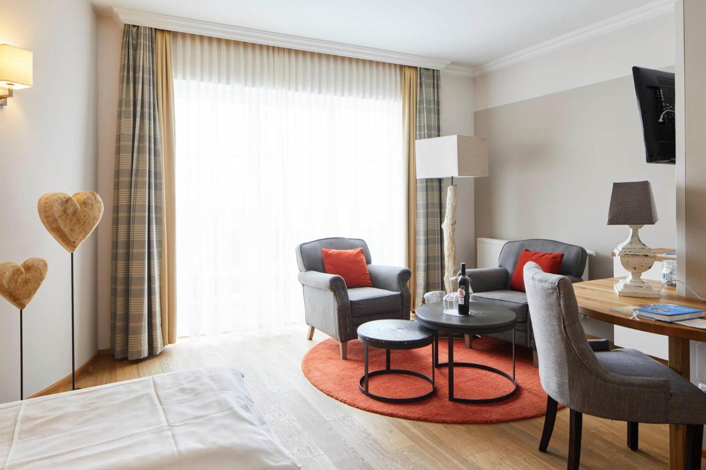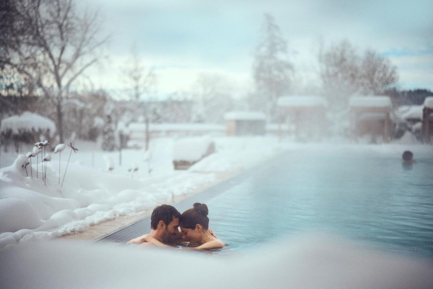 Guests can relax in the wellness area, including an indoor pool, a sauna and a hot tub, or in the garden.