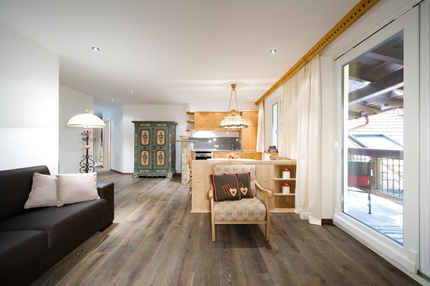 Two-Bedroom Apartment. Two-bedroom apartment in modern Alpine style on the highest floor with a living room combined with a kitchen area with a dishwasher and a west-facing balcony with panoramic views. A private locker is reserved in the ski storage room equipped with a boot dryer. The apartment has a private bathroom with shower.