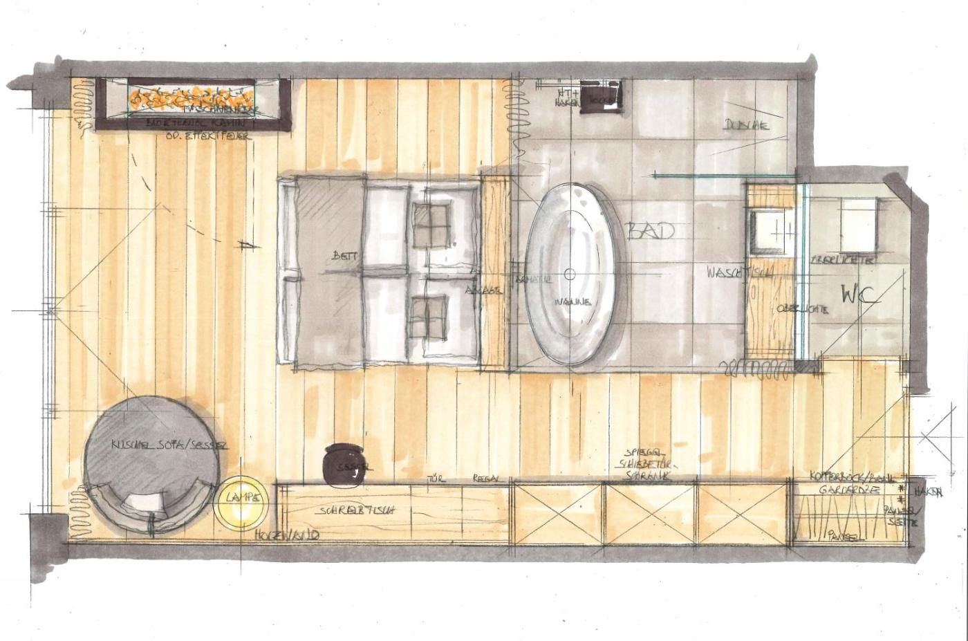 Junior Suite. Suite featuring native larch wood, adobe walls, suede, and natural stone. ;