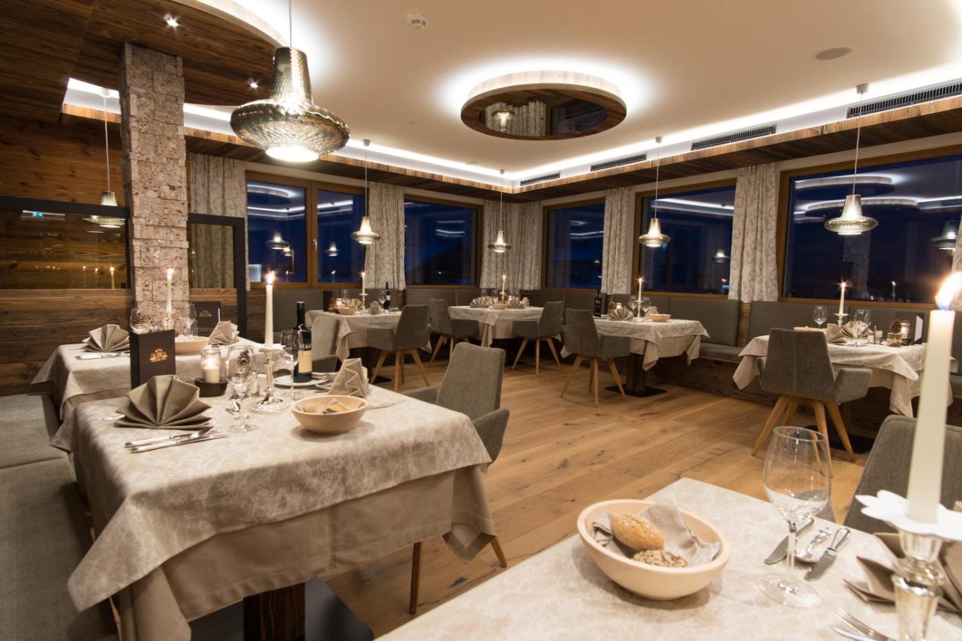 The hotel blends modern and traditional features. The bar and dining area have wood-paneled walls and traditional tiled stoves and also a glass-fronted fireplace. Food can also be enjoyed on the terrace. Special diet menus can be arranged upon request.