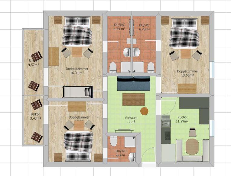 Three-Bedroom Deluxe Apartment. The spacious apartment has 3 bedrooms and 1 bathroom with a bath and free toiletries. In the well-fitted kitchen, guests will find a stovetop, a refrigerator, a dishwasher and kitchenware. The apartment features a washing machine, soundproof walls, a coffee machine, a flat-screen TV with satellite channels, as well as garden views. The unit has 3 beds.