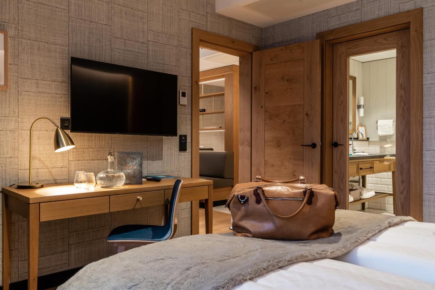 Deluxe Double Room Northside. This luxurious room features a balcony overlooking the Silvretta Mountain Range, a private bathroom with a freestanding bath tub, a flat-screen TV and a living area with a sofa, a seating area and a dining table. ;