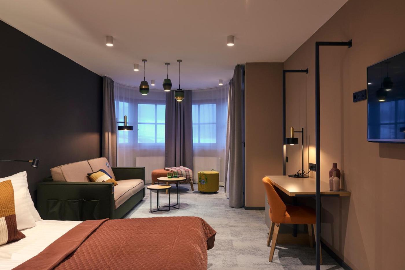 Premium Double Room. This spacious room features a seating area or sofa, a workstation with USB sockets, and a modern bathroom. ;