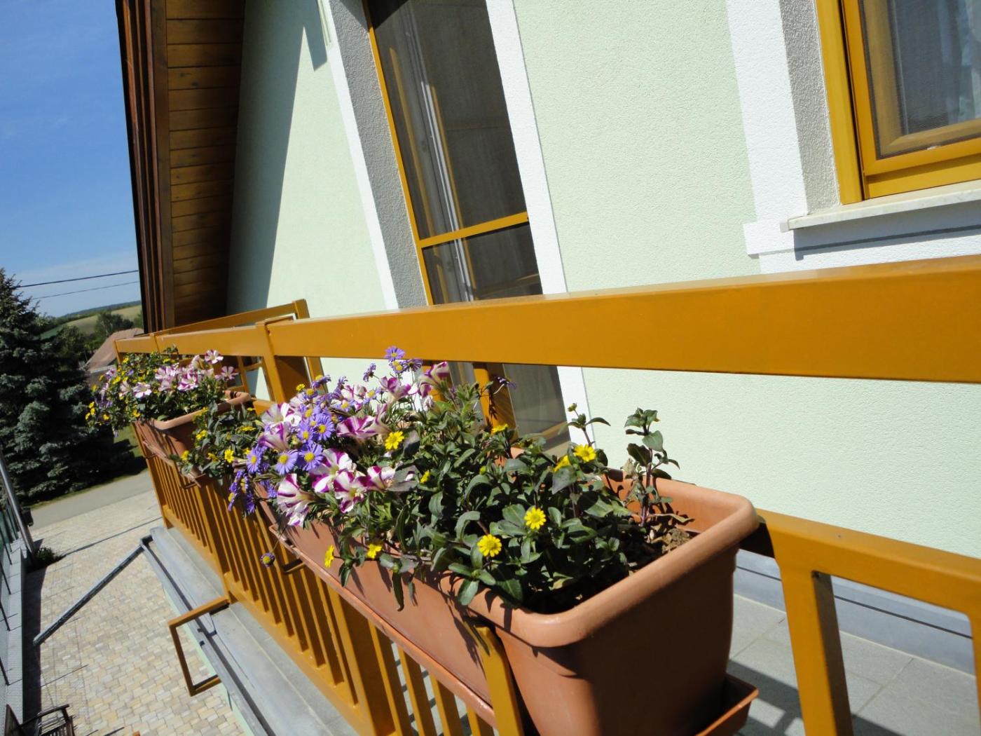 Double Room with Balcony. Quiet room with solid wooden beds, hardwood floors and a private bathroom. Decorated in red and orange with free Wi-Fi. The balcony offers views of Waltersdorf. ;