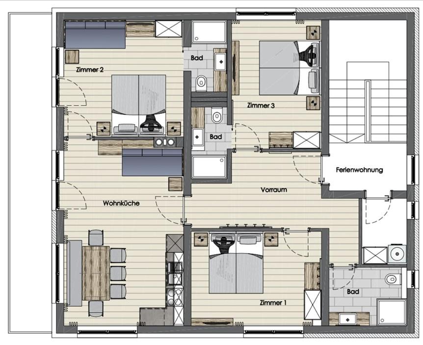 Three-Bedroom Apartment. This spacious apartment comprises 1 living room, 3 separate bedrooms and 3 bathrooms with a walk-in shower and a hairdryer. In the kitchen, guests will find a stovetop, a refrigerator, a dishwasher and kitchenware. Featuring a balcony with garden views, this apartment also provides a coffee machine and a flat-screen TV. The unit offers 5 beds.